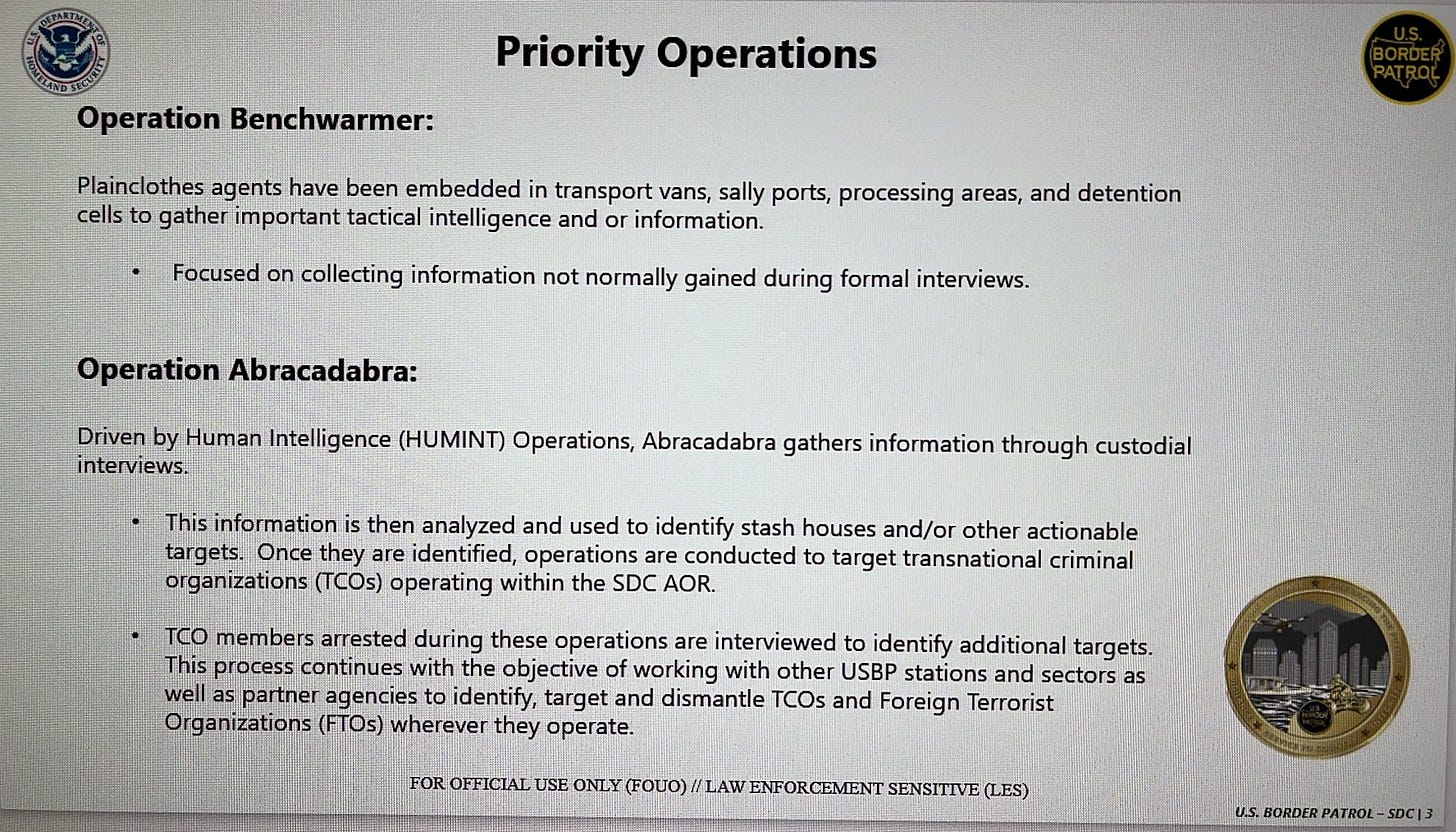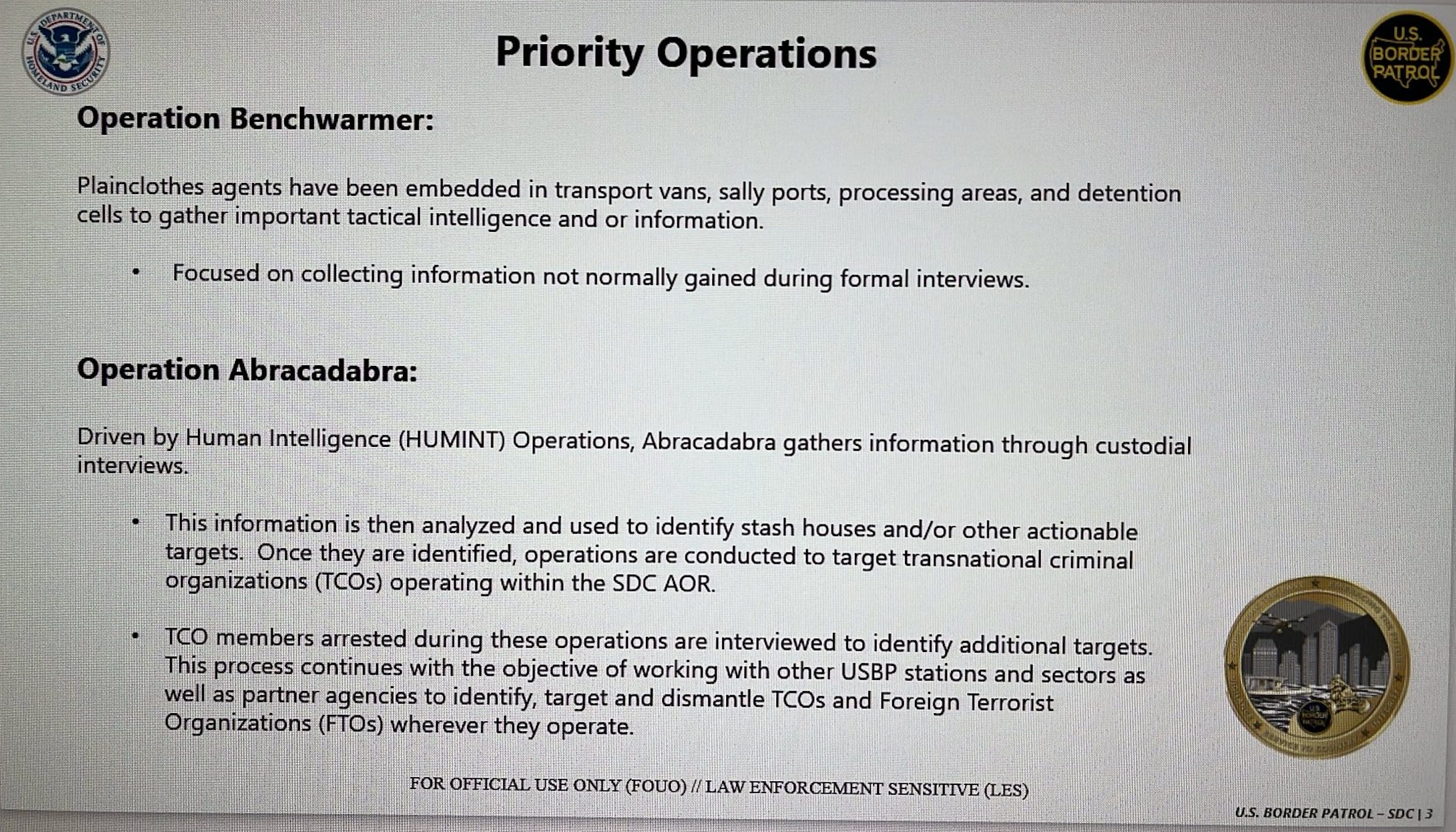 “Operation Abracadabra was initiated with the requirement of Interviewing 100% of individuals apprehended to gather intelligence and identify follow-on targets such as stash houses and individuals conducting illegal activity,” one of the documents, a briefing slide, reads. The purpose, it continues, is “Tying every individual who crosses the border illegally to a Foreign Terrorist Organization, a Transnational Criminal Organization, and/or utilizing the intelligence to develop targets.”