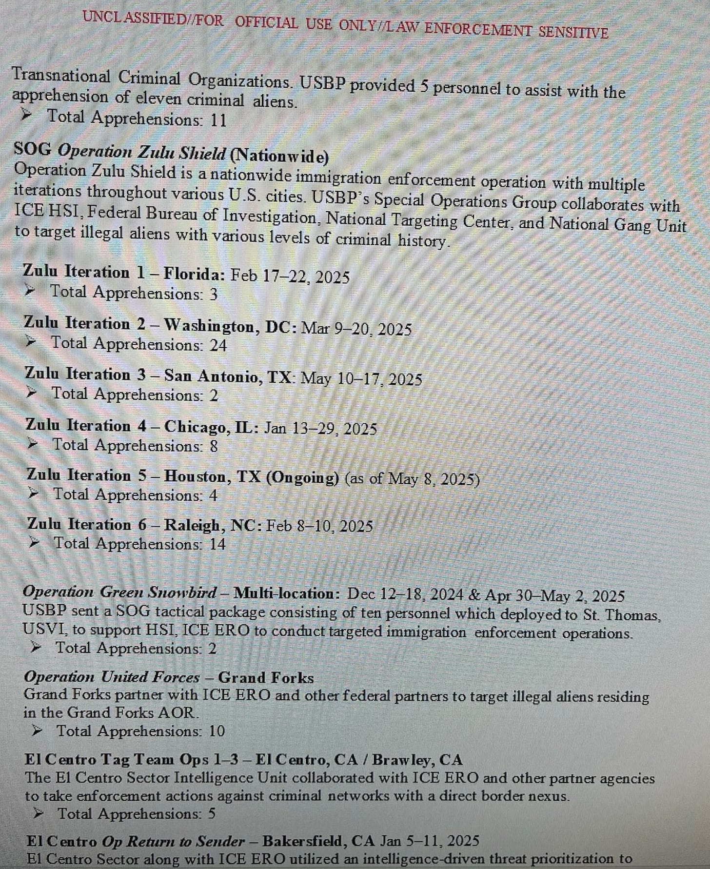 A 15-page long document, marked “LAW ENFORCEMENT SENSITIVE,” details 21 different “major” ICE operations resulting, so it says, in 6,852 apprehensions since June. From Operation A, a covert effort to develop informants among immigrants in detention, to Operation Benchwarmer, which alone spans the deployment of 2,000 “intelligence assets” across the country, the document gives a sense of how aggressively ICE is scouring neighborhoods and developing sources to spy on immigrants and Americans alike.