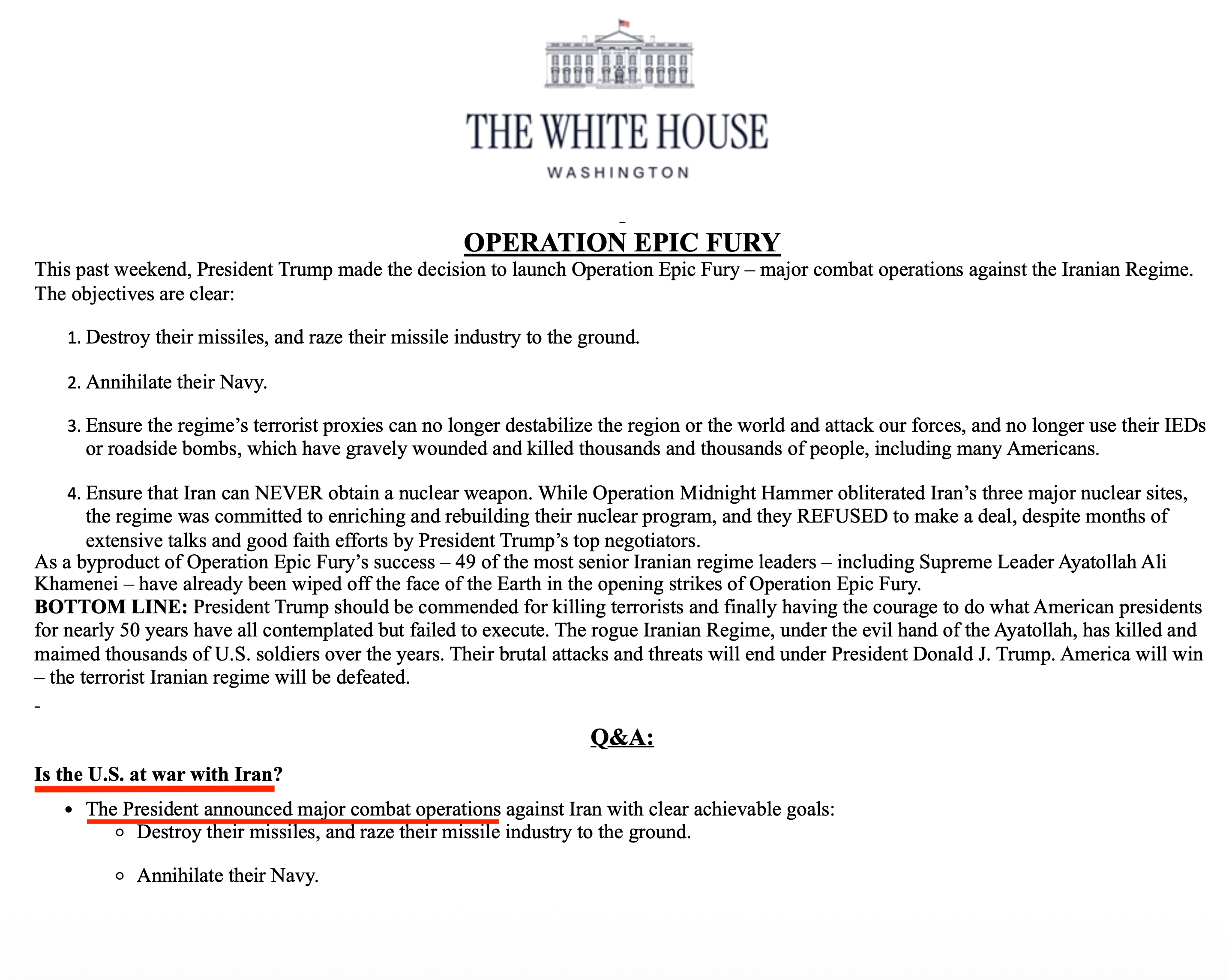 Graham, it turns out, was repeating White House talking points circulated to Republican members of Congress instructing them to push back on the question, “Is the U.S. at war with Iran?” by instead calling it “major combat operations against Iran…”