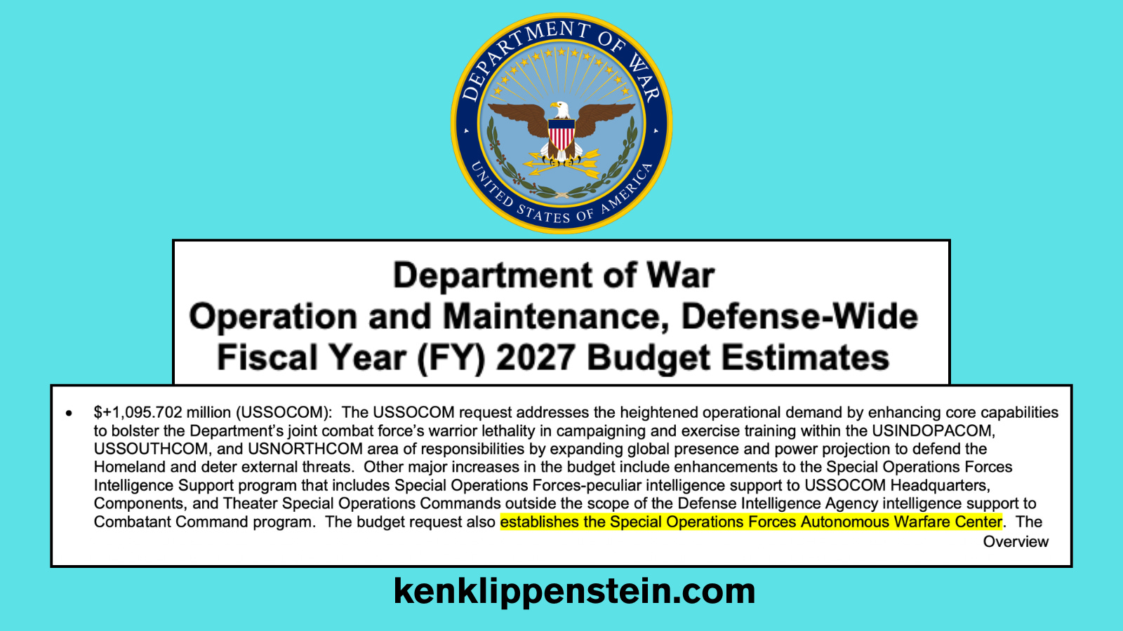 The new “Special Operations Autonomous Warfare Center” is referenced in the $1.5 trillion Department of War budget request to Congress this week.