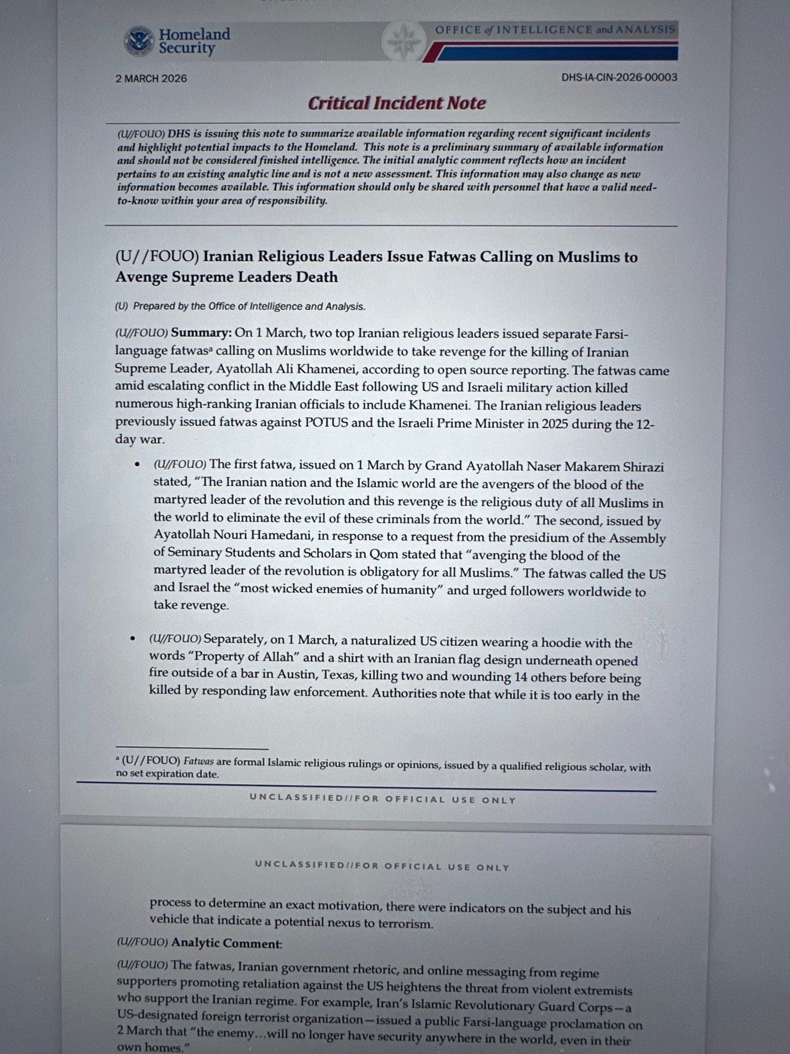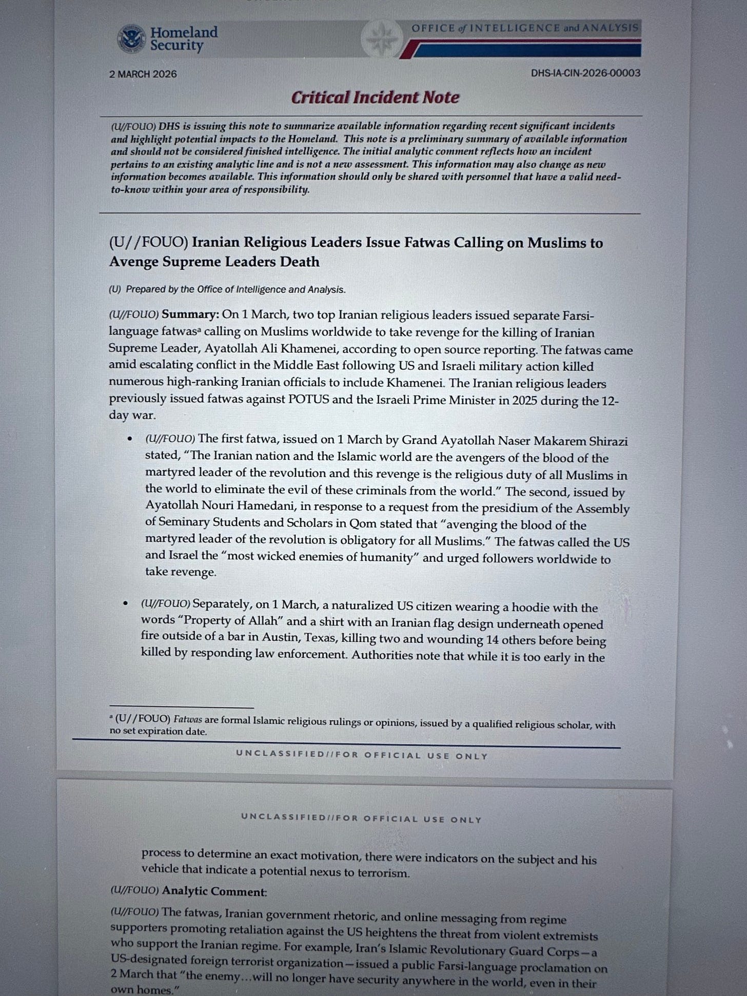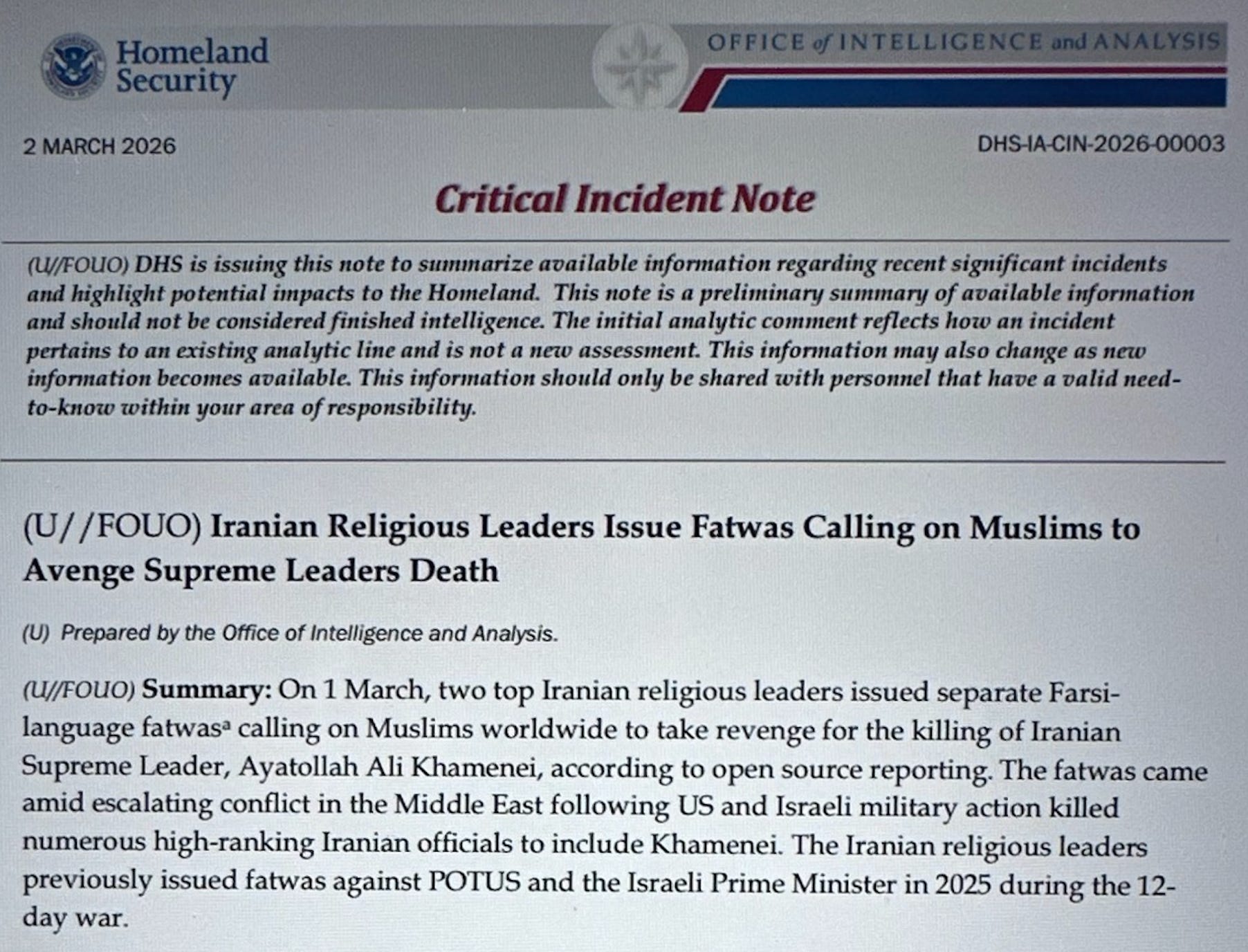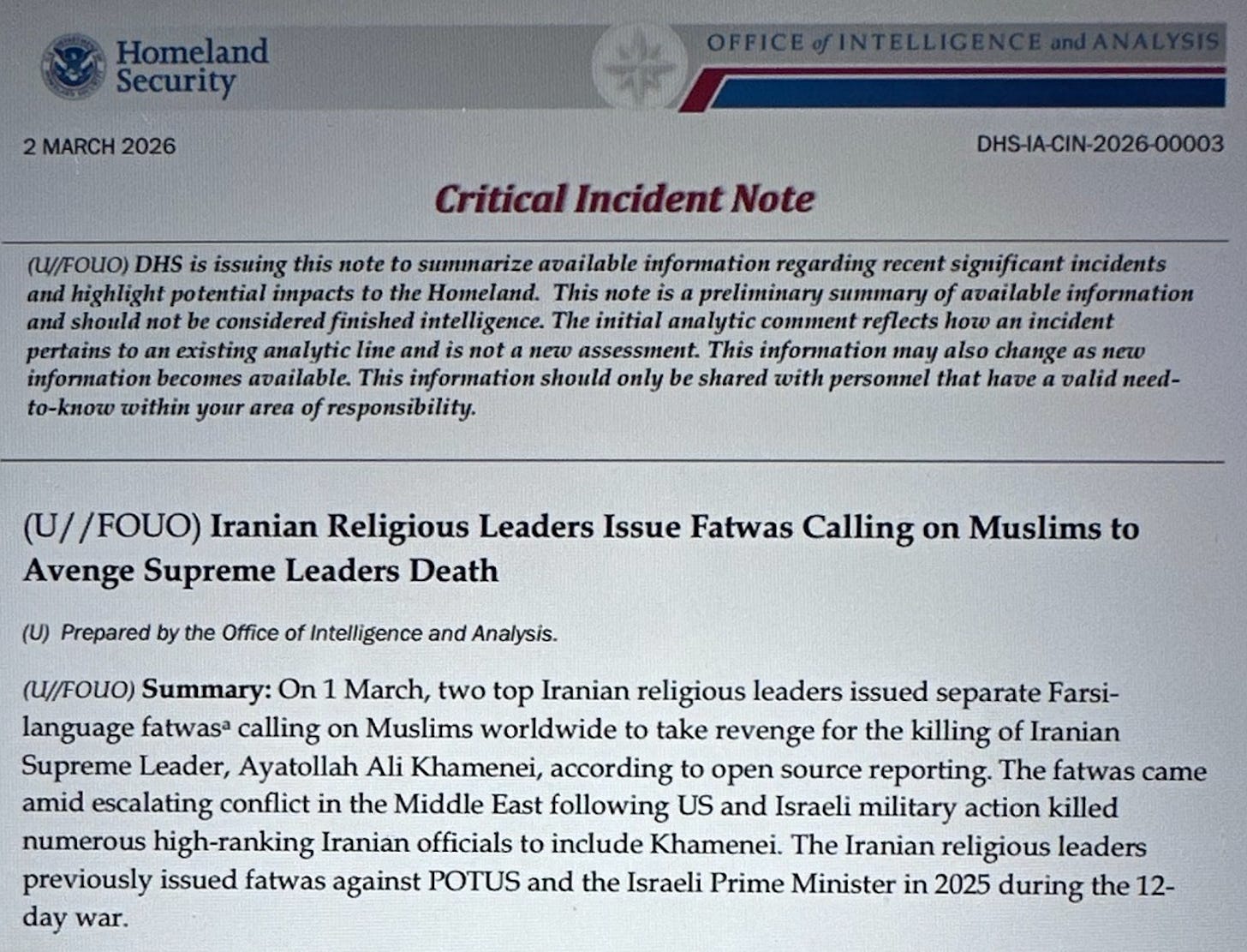 The Department of Homeland Security is circulating a “critical incident note” warning that Iran has issued two “fatwas” for Muslims to avenge the killing of Ayatollah Ali Khamenei, orders that the department sees as predicting a terrorist strike on America.