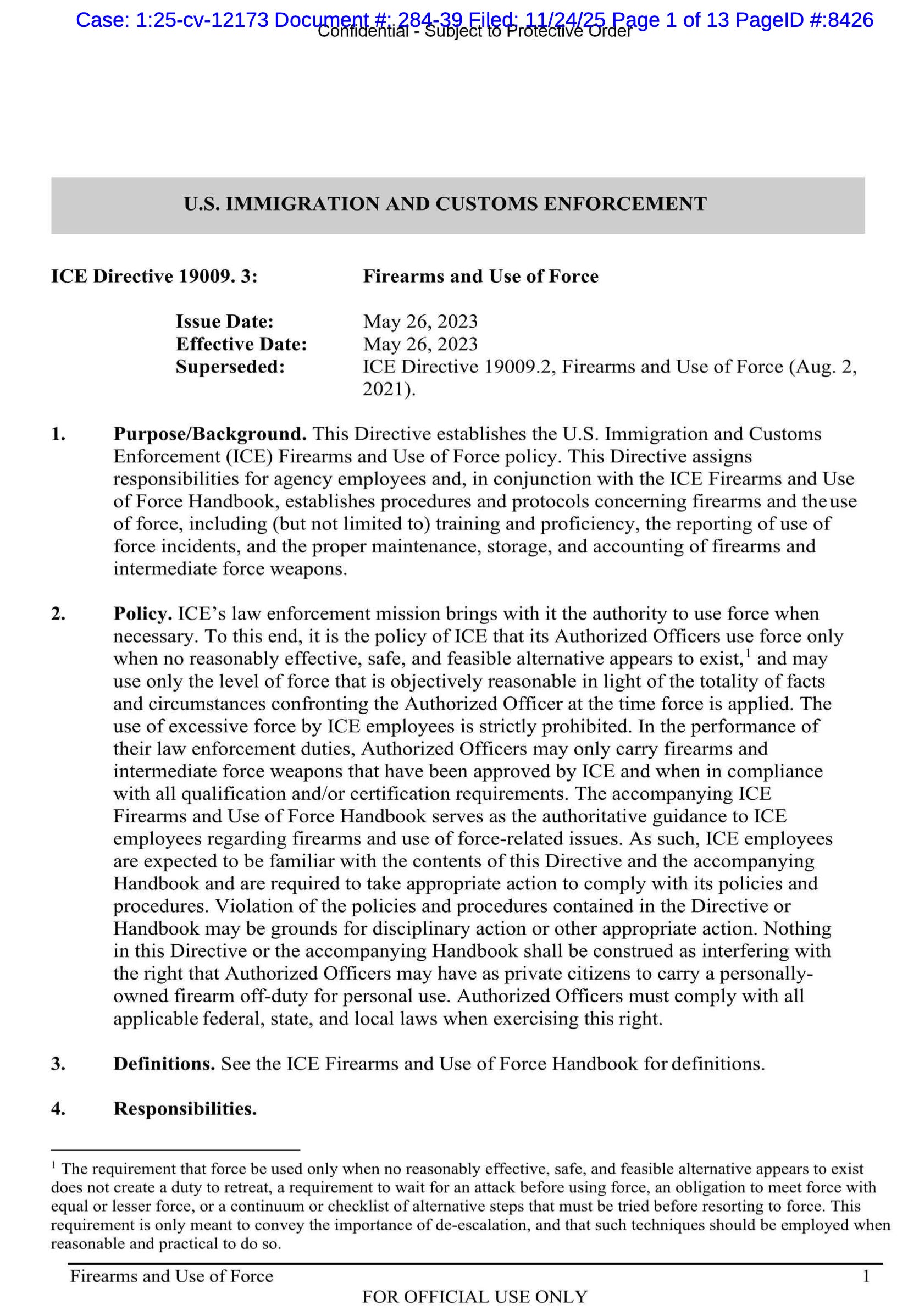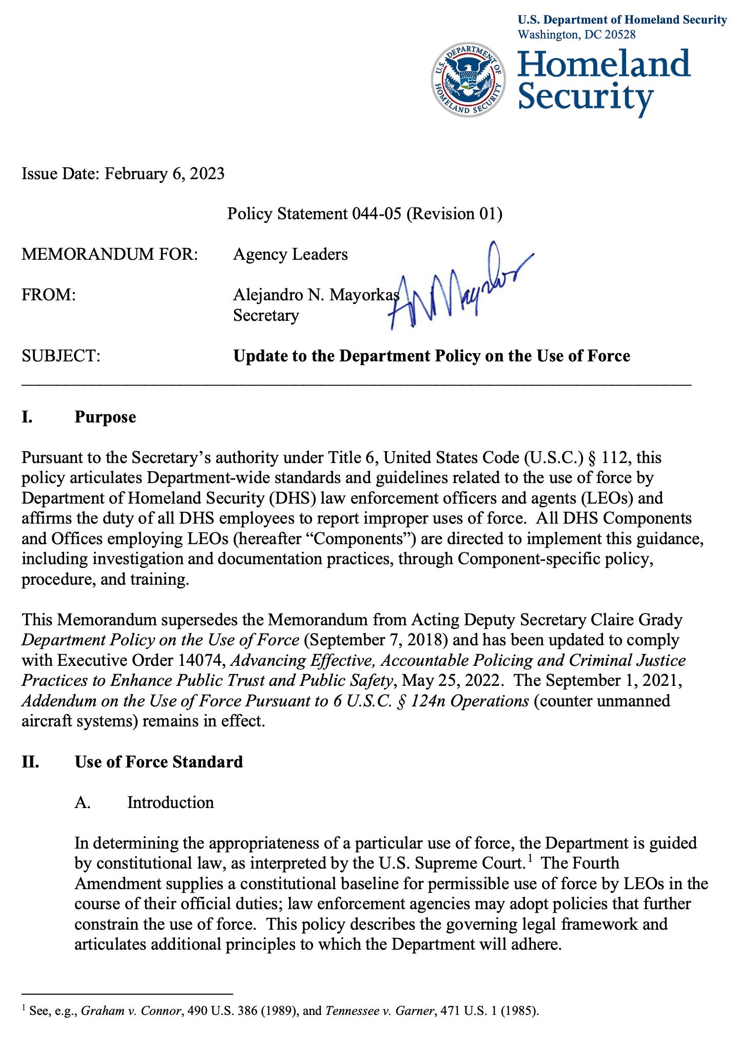The first document is homeland security’s overall use of force policy, a 13-page document updated in 2023 from a similar 2018 policy.