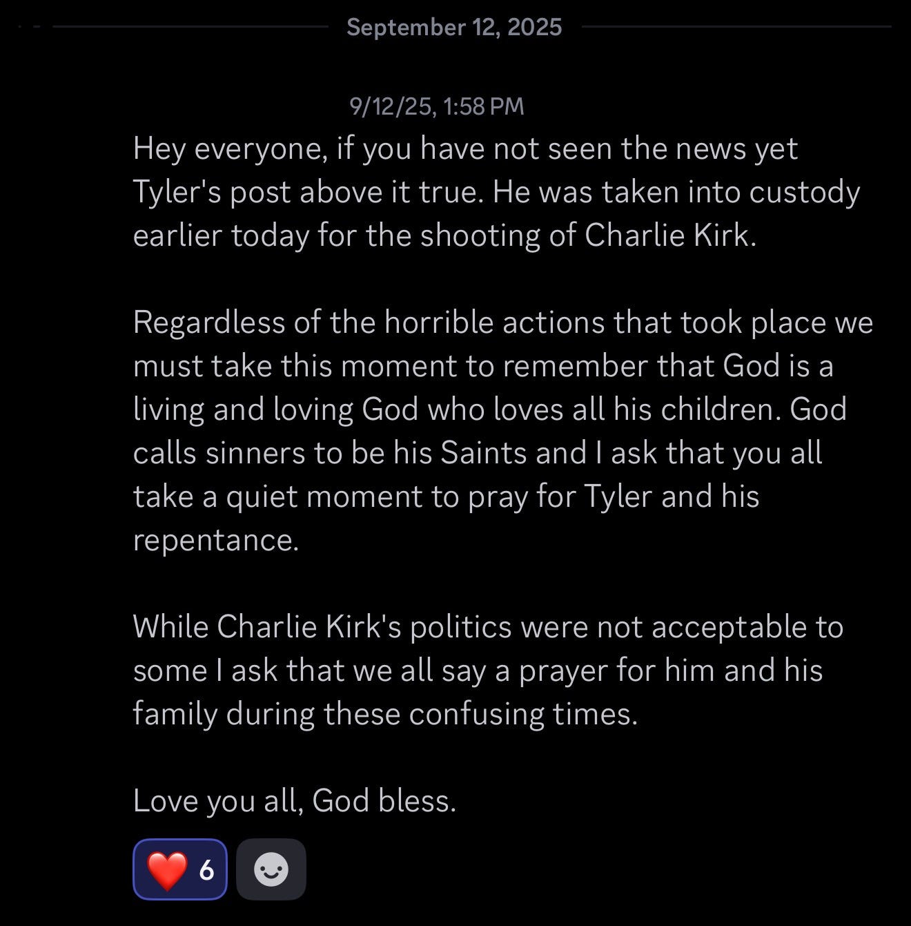 “Regardless of the horrible actions that took place we must take this moment to remember that God is a living and loving God who loves all his children,” a Discord post from another friend posted the day after the shooting reads. “While Charlie Kirk's politics were not acceptable to some l ask that we all say a prayer for him and his family during these confusing times.”