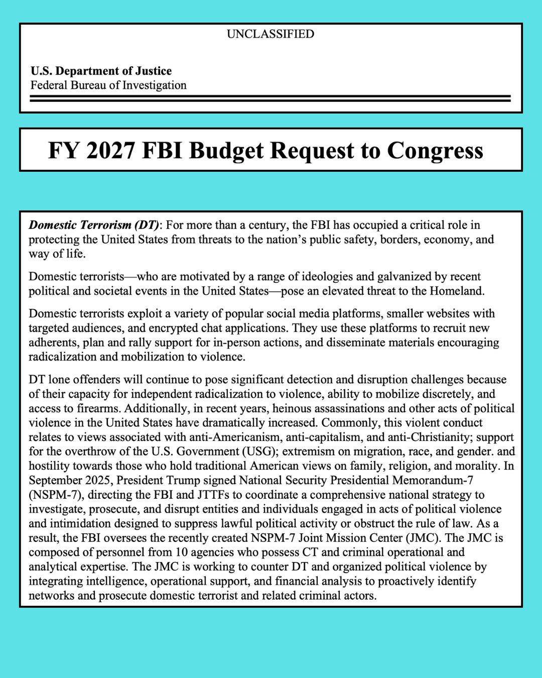 Now, Trump’s budget request reveals, the FBI runs a dedicated “NSPM-7 Joint Mission Center”; with personnel from 10 federal agencies, it is busy “proactively” identifying domestic terrorists motivated by any of the following beliefs: