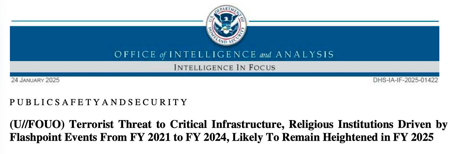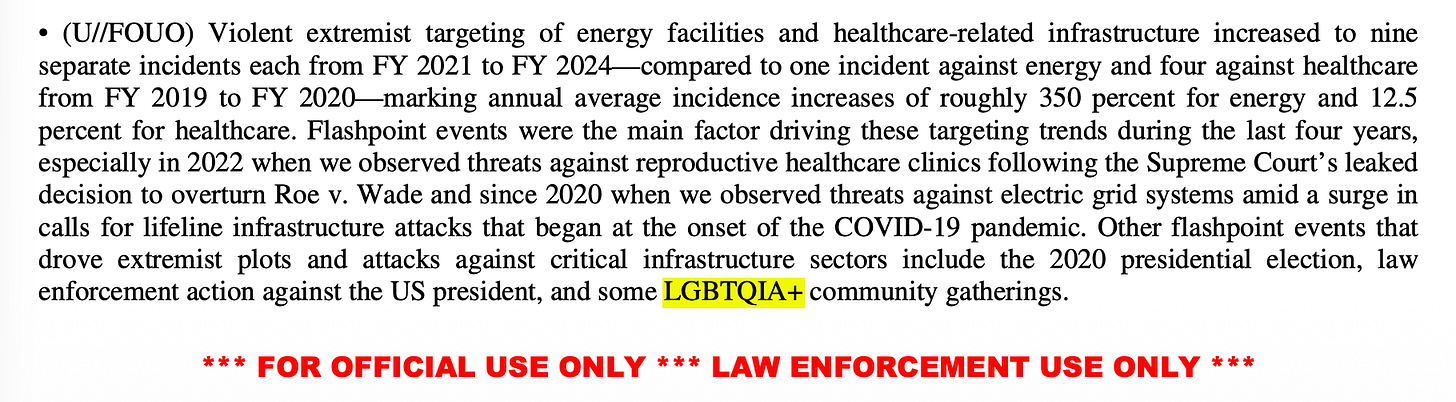The 11-page threat report covers everything from suicide drone attacks and improvised explosive devicess, sketching out the dangers to “LGB+” people, gay couples, Hispanic people, Jewish people, Muslims, Arabs, Sikhs, South Asians, Middle Easterners. Even Luigi Mangione makes an appearance! But nowhere in the entire report are transgender people mentioned — again, the highest risk group in the LGBT community.