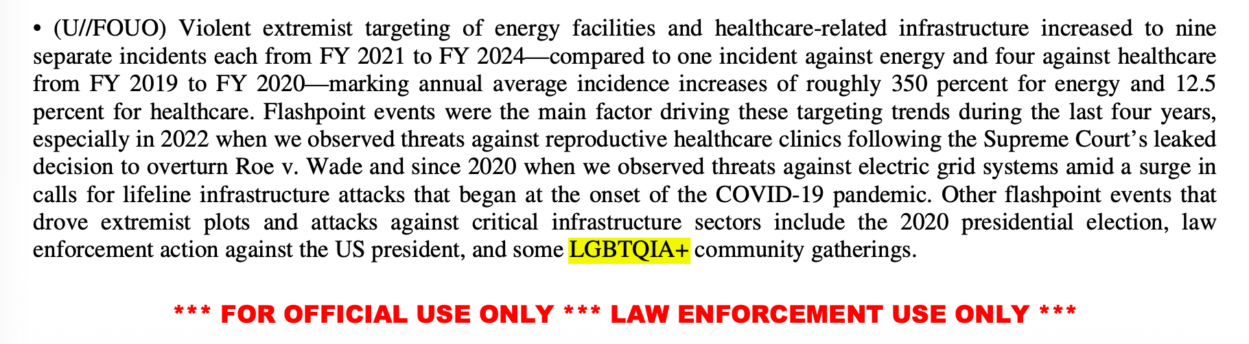 From Trump’s first term through Biden, agencies used “LGBT” or even longer formulations like “LGBTQIA+” in their threat products. These and other documents were provided to me by the transparency nonprofit Property of the People, which obtained them under open records requests.
