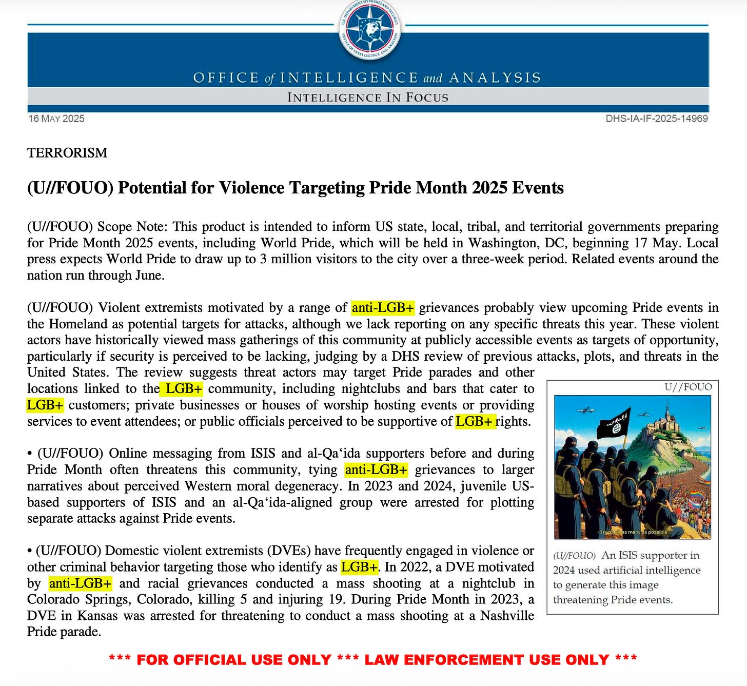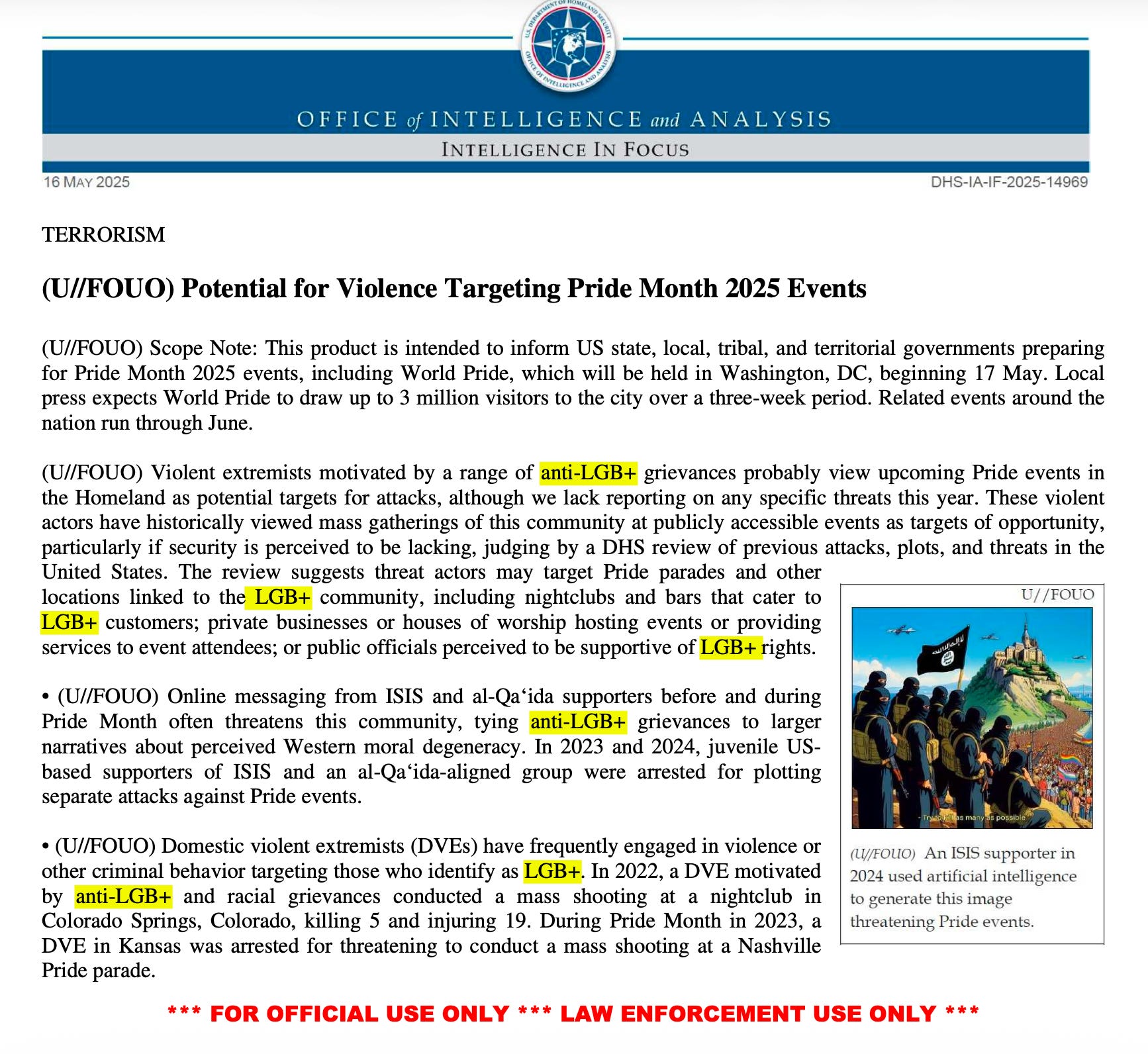 But by May, the same agency had dropped the acronym , according to another report about the potential for a terror attack targeting Pride Month in general.