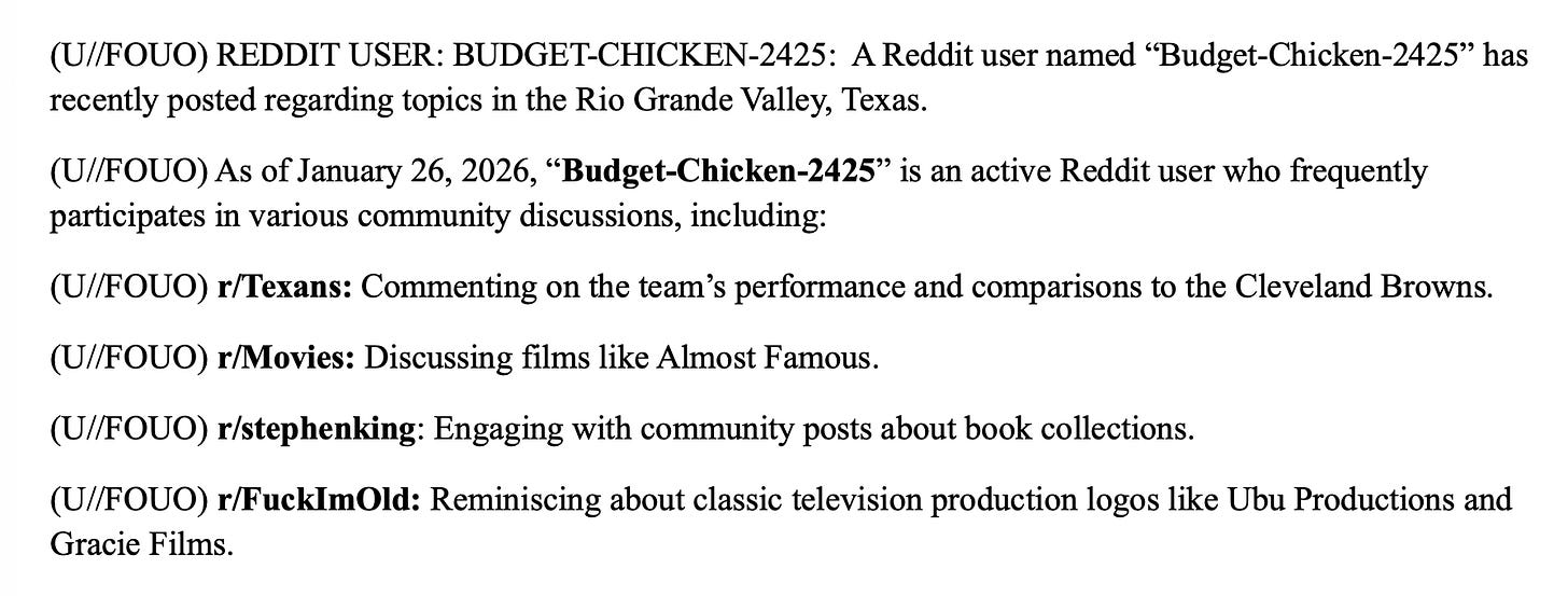 The spying is revealed in a January intelligence bulletin produced by the Border Patrol and leaked to me. The subject of the report is Reddit user “Budget-Chicken-2425,” who is not a narco-trafficker, gang member, or terrorist. Just someone concerned about federal overreach.
