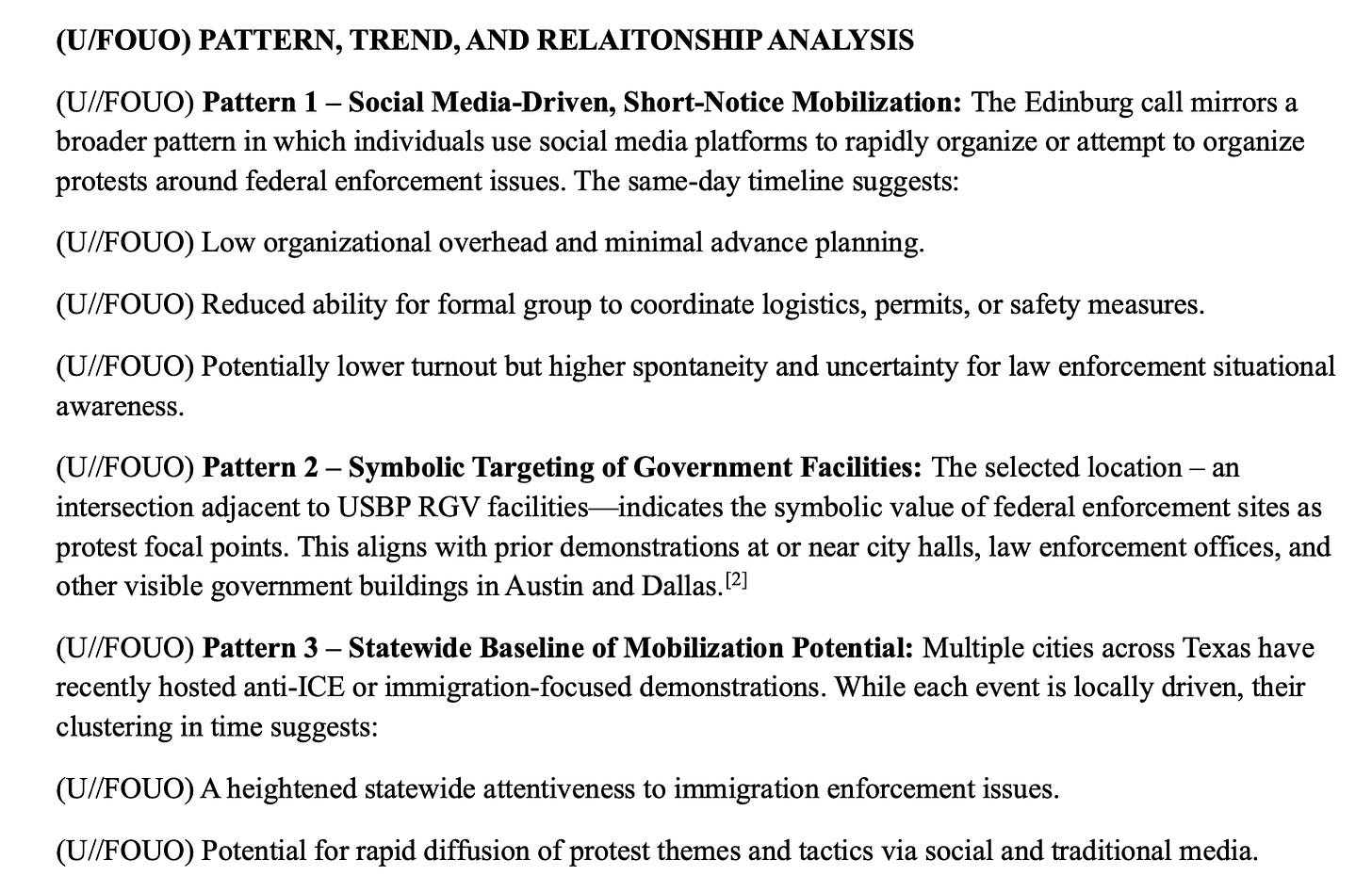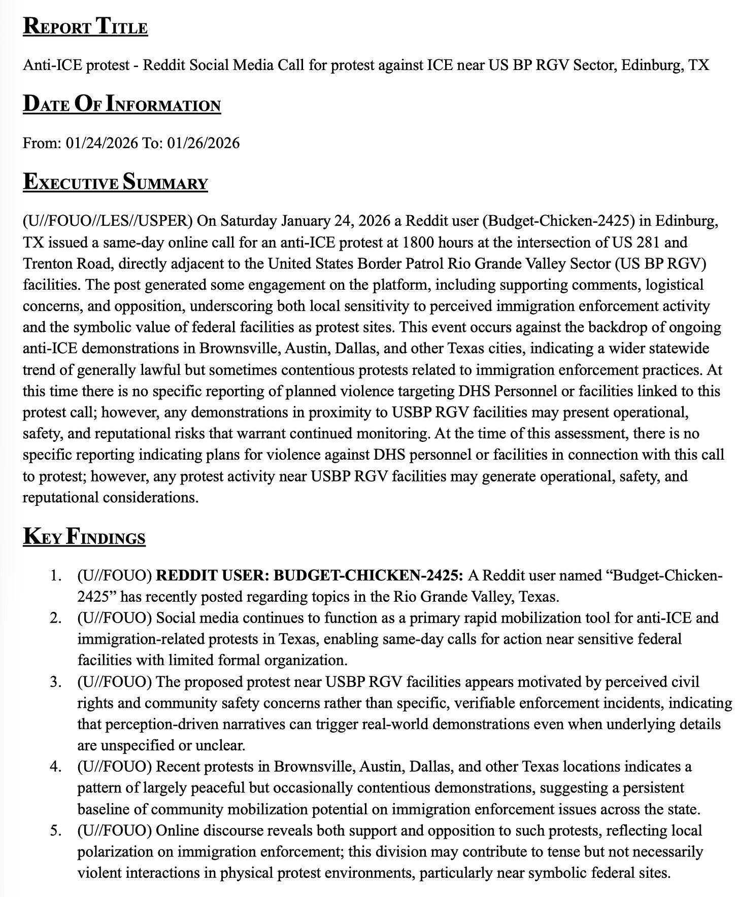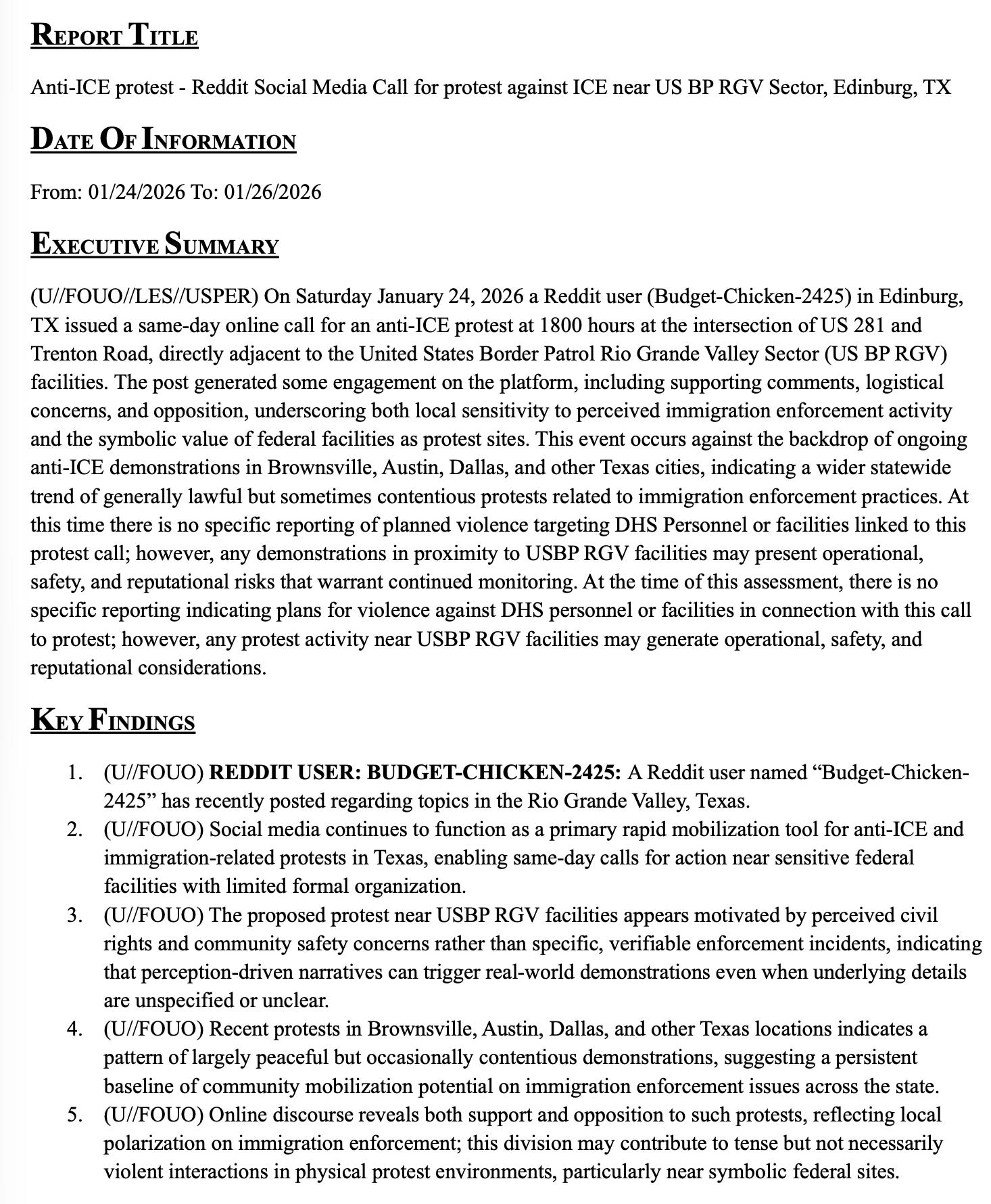 The report centers on Budget-Chicken’s call for a protest near a Border Patrol facility in Edinburg, Texas. Though the report acknowledges that anti-ICE protests throughout Texas have been “generally lawful” and that there’s no evidence of any threat posed by Budget-Chicken’s call, any protest whatsoever near the border patrol facility is said to “warrant continued monitoring.”