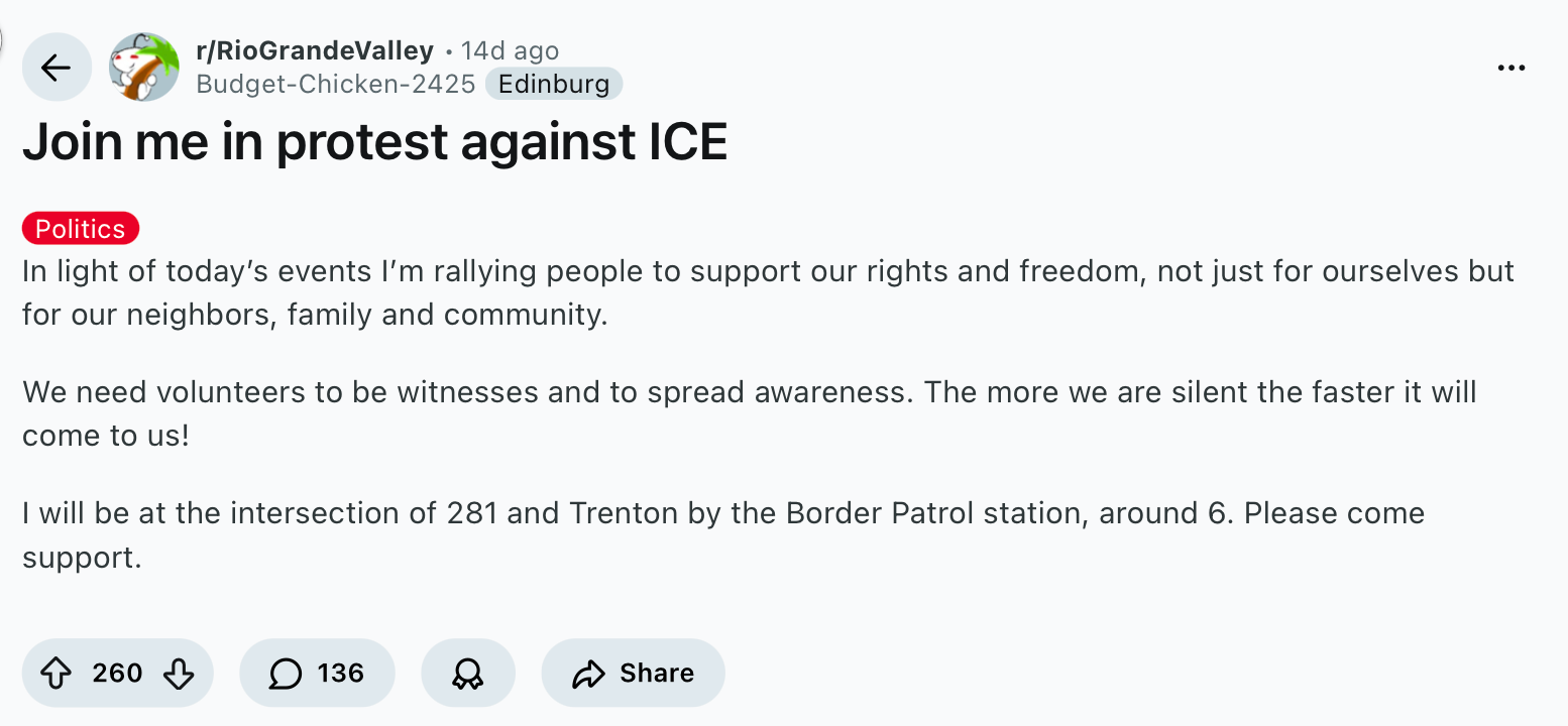 Budget-Chicken’s offending Reddit post was on the r/RioGrandeValley channel. Titled “Join me in protest against ICE,” the post is just a few sentences long, calling on “neighbors, family and community” to “be witnesses and to spread awareness” by protesting a Border Patrol station.