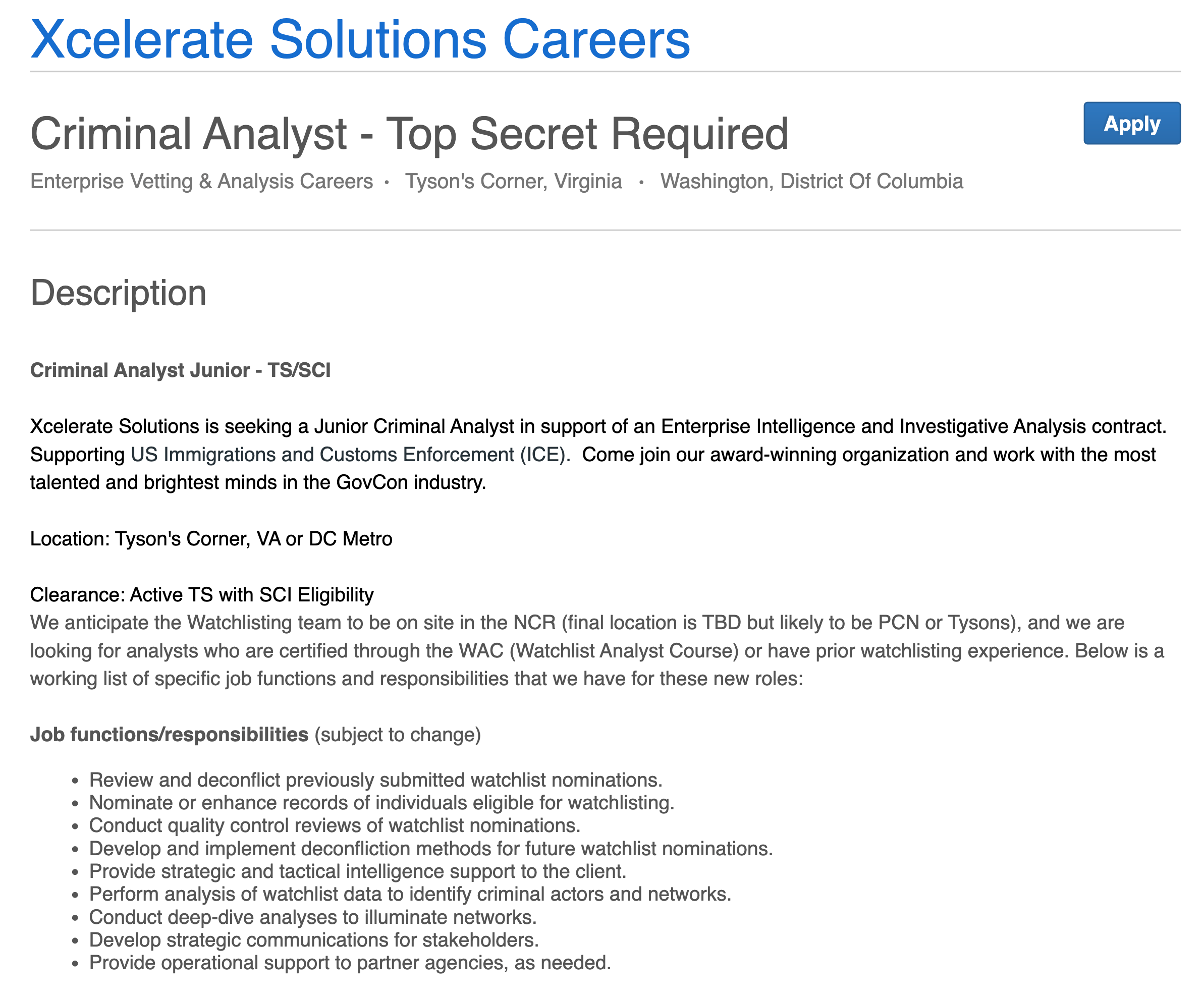 The company, Xcelerate Solutions, is looking for a Top Secret-cleared analyst to join the “watchlisting team” for the purpose of “Supporting US Immigration and Customs Enforcement (ICE),” to quote from the job announcement.