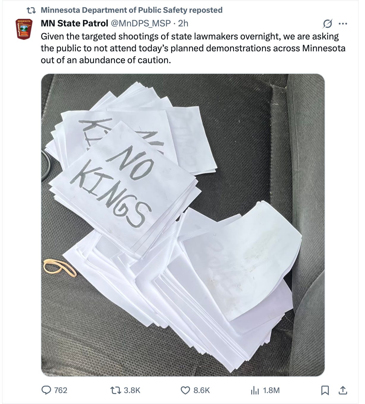 The Minnesota Department of Public Safety itself — the agency Walz quoted — reposted a release by the Minnesota State Patrol containing a pile of paper’s found in the shooter’s car with the words “NO KINGS” written on it. Lacking any context about the shooter’s targeting of Democratic officials, the post has gone viral among right wing accounts on social claiming that this is proof that the shooter is a left-wing member of the No Kings protests.