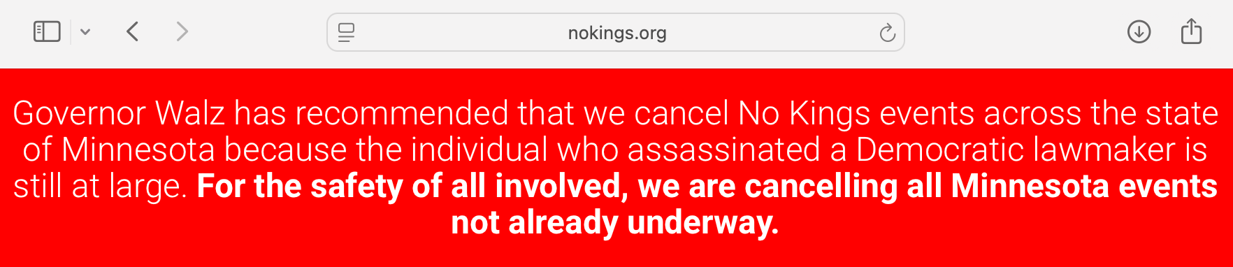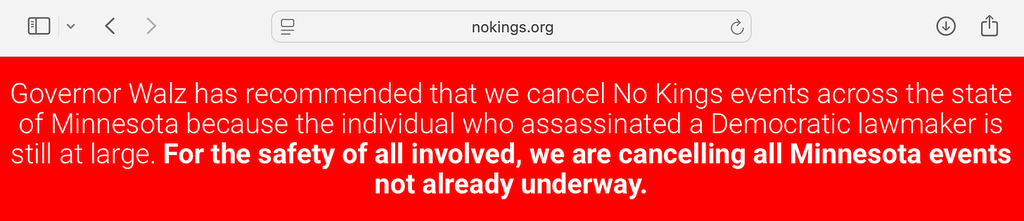 The No Kings official website has canceled all planned protests in Minnesota, according to a bright red banner across the top of their website.