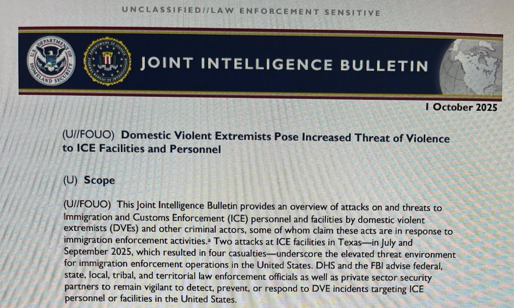 “Two attacks at ICE facilities in Texas — in July and September 2025, which resulted in four casualties — underscore the elevated threat environment for immigration enforcement operations in the United States,” the intelligence Bulletin says. “Since June 2025, DVEs in at least three states have conducted two targeted, pre-planned violent attacks against ICE personnel and facilities and additional unplanned, reactive violent attacks that took advantage of First Amendment-protected activity.”