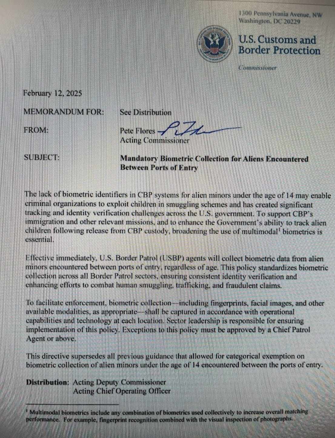 “Effective immediately, U.S. Border Patrol (USBP) agents will collect biometric data from alien minors encountered between ports of entry, regardless of age … To facilitate enforcement, biometric collection - including fingerprints, facial images, and other available modalities, as appropriate shall be captured in accordance with operational capabilities and technology at each location.”