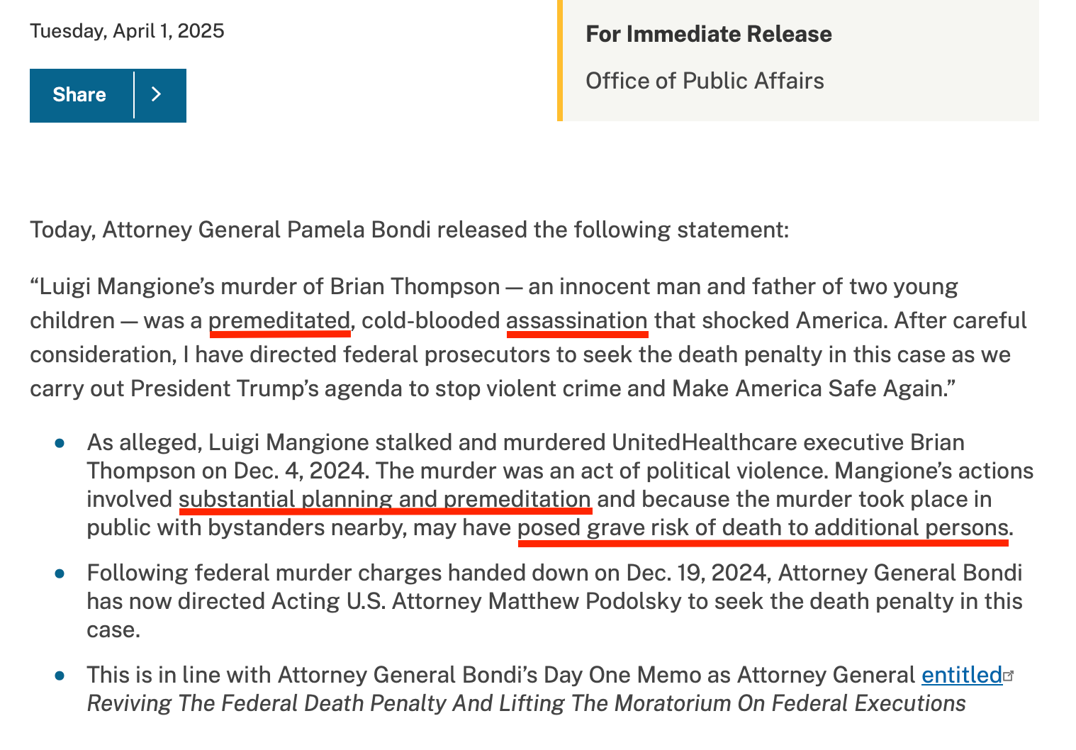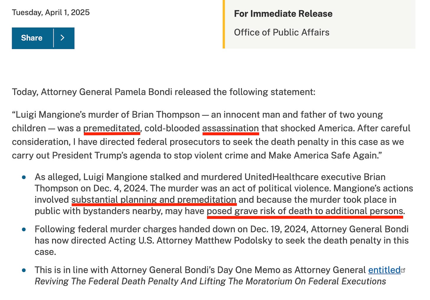 What separates the three cases from the others isn’t the body count, but the political motives involved. That’s why they alone did not receive commutations; and is why Mangione is facing the death penalty today. Because in the Trump administration’s mind, murdering a CEO is a terrorist act equivalent to what al Qaeda did on 9/11.
