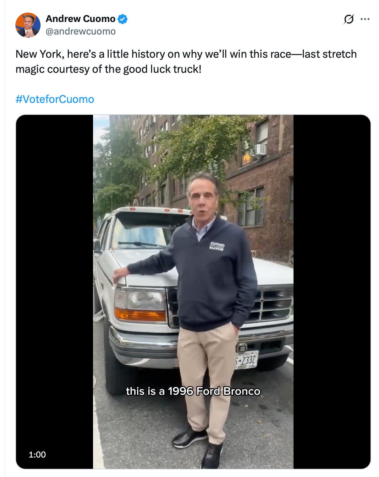 All the production value in the world won’t make social media content viral if it lacks a compelling message. Cuomo learned this the hard way, when after losing the primary, he pivoted to short video content that quickly became a laughingstock on social media because of how scripted and empty it all was. Instead of Mamdani’s spontaneous interactions with ordinary people, Cuomo’s videos focused on himself: jumping a car, standing in front of a 1996 Ford Bronco, or just plain standing there while he talks at you.