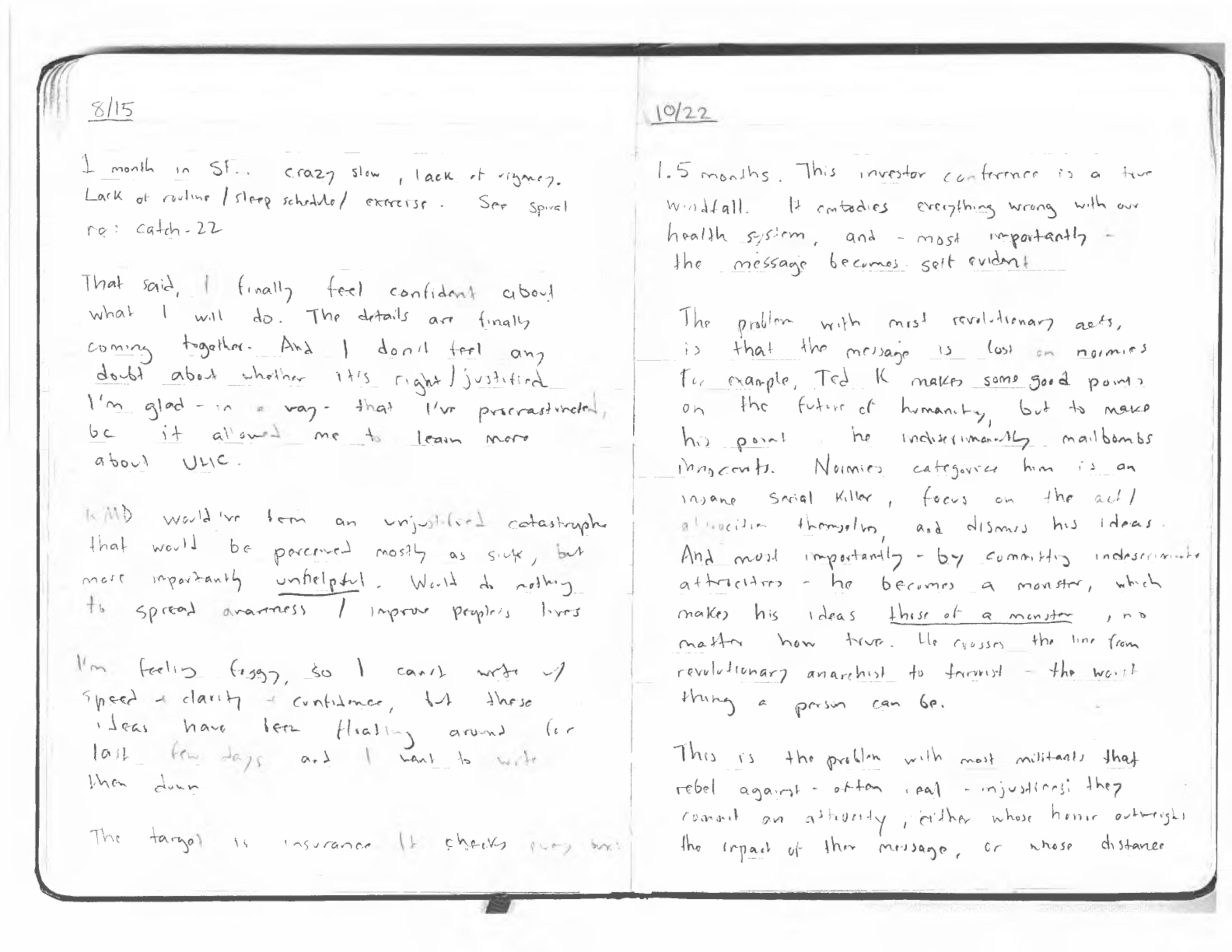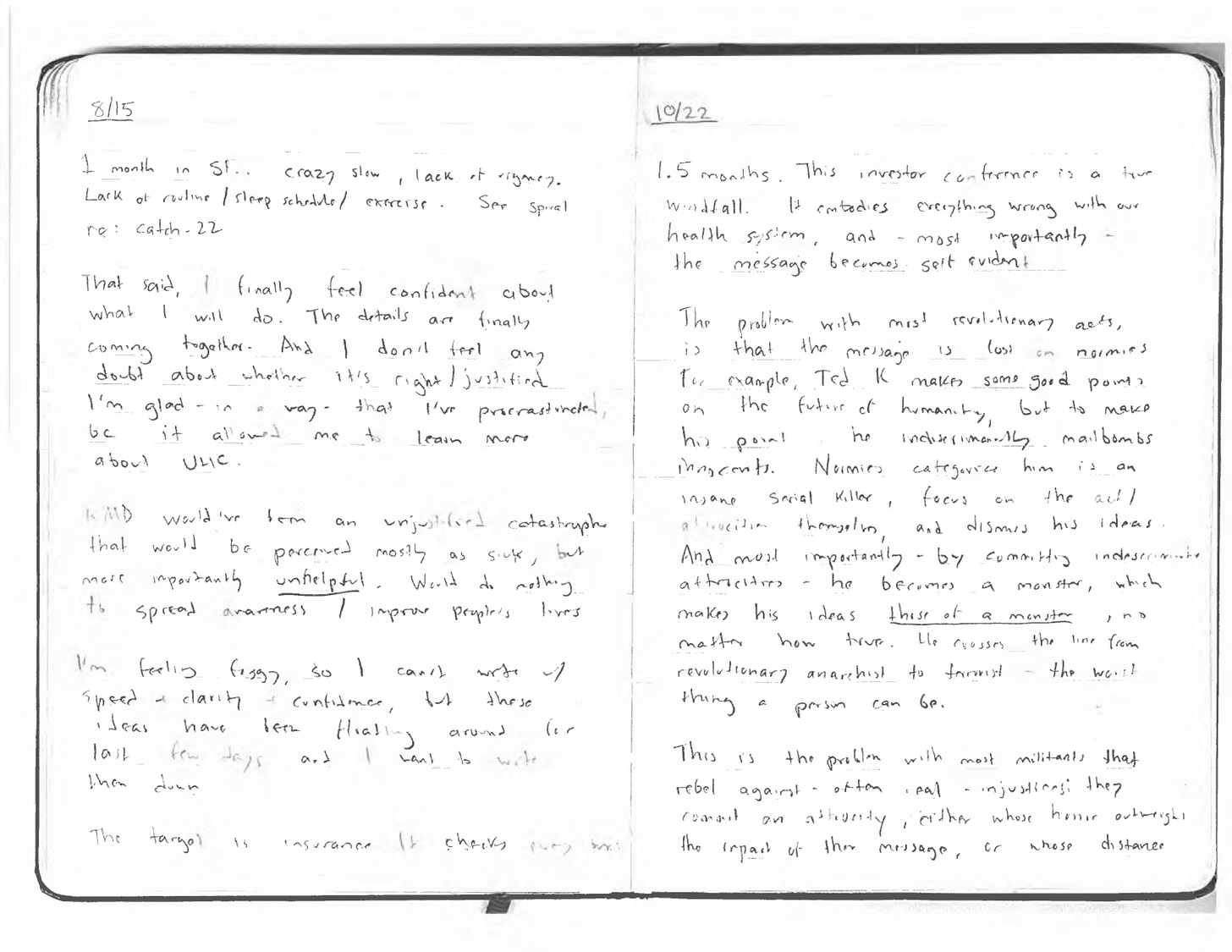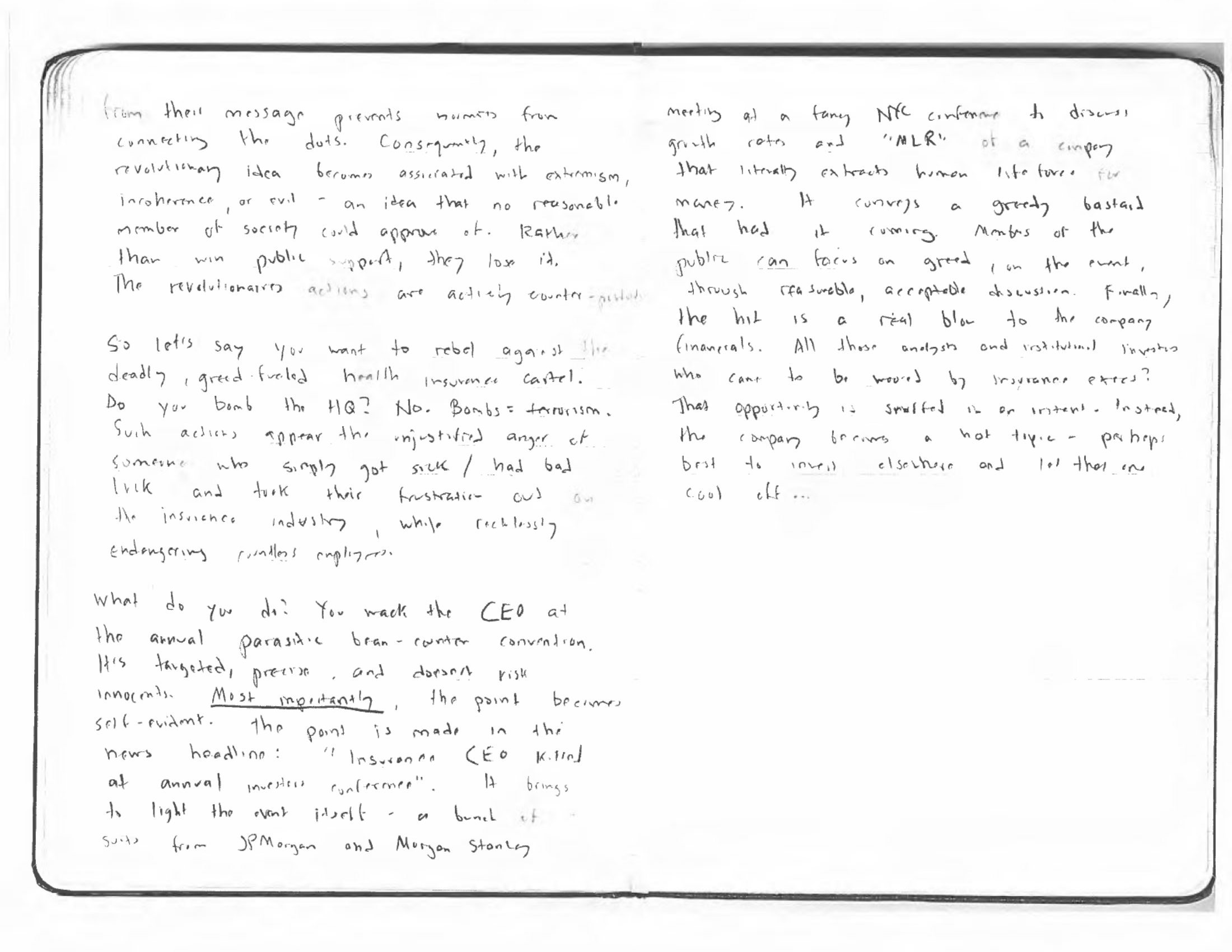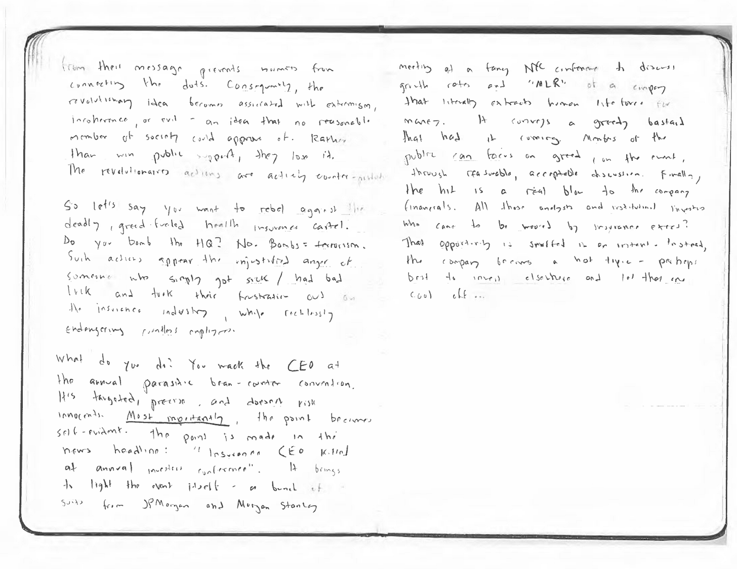 “This investor conference is a true windfall,” Mangione writes, referring to the corporate meeting in Midtown where the murder would later occur. “It embodies everything wrong with our health system, and — most importantly — the message becomes self-evident.”