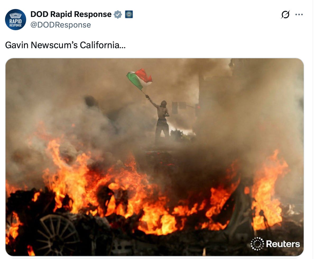 Yesterday, an official Defense Department “rapid response” X (Twitter) feed posted a photo of the charred remnants of a car and a protester waving a Mexican flag around with the label: “Gavin Newscum’s California.”