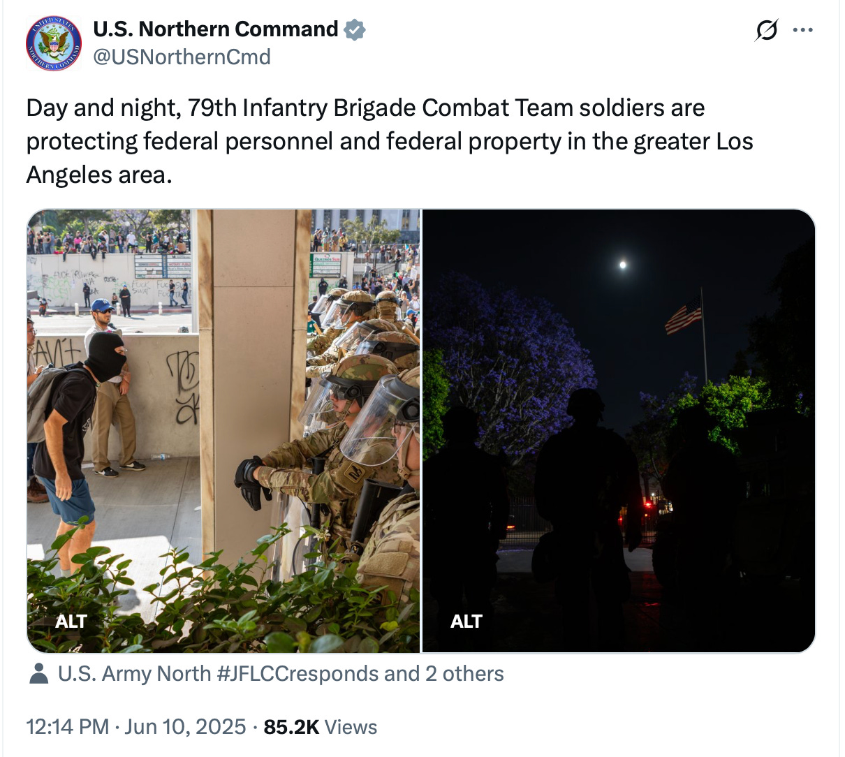 Take, for example, the U.S. Northern Command’s photo op today, depicting nine fearless warriors of the “79th Infantry Brigade” standing up to some lawless LA mob, “day and night,” per its official statement.