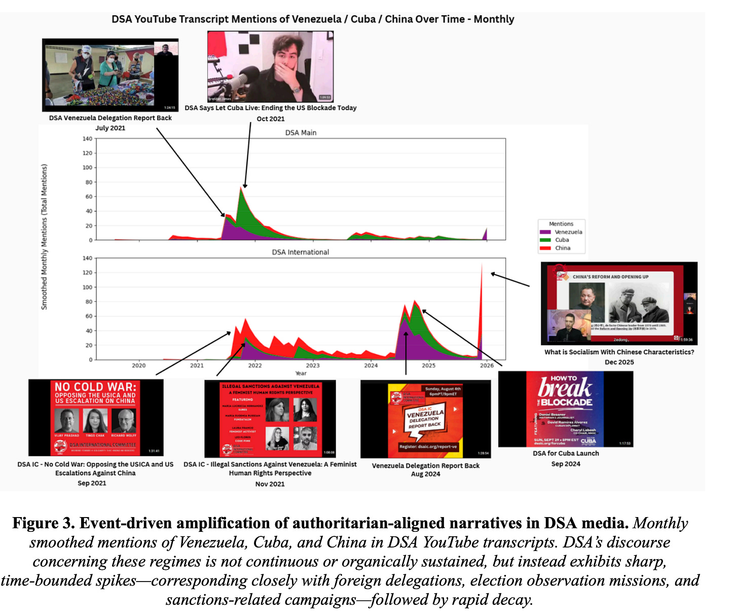 The nonprofit Network Contagion Research Institute (NCRI) just rolled out a 29-page report accusing DSA of “convergence with hostile foreign states,” the operative word here being “convergence” because coordination isn’t shown. Instead, the researchers used things like AI modeling to argue that the DSA's talking points on things like sanctions and election integrity "synchronize" with the narratives of the Venezuelan, Cuban, and Chinese governments. This along with some DSA delegation visits to these countries was enough for the report to demand a Justice Department investigation into whether they are foreign agents.