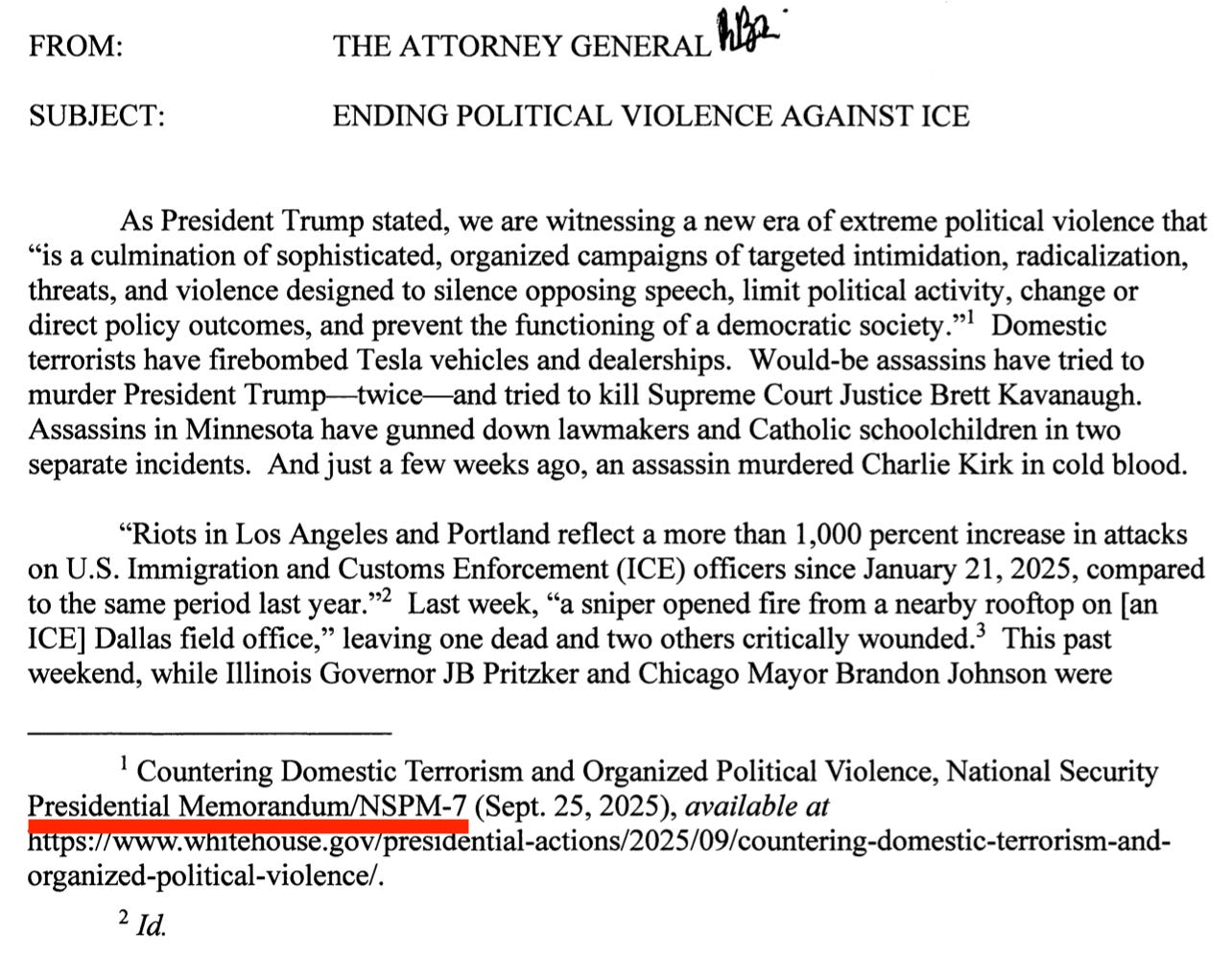As Bondi’s directive goes on to quote from NSPM-7 specifically, targeting for arrest and prosecution “every person who aids, abets, or conspires” (whatever that means) with these anti-ICE forces of domestic terrorism.