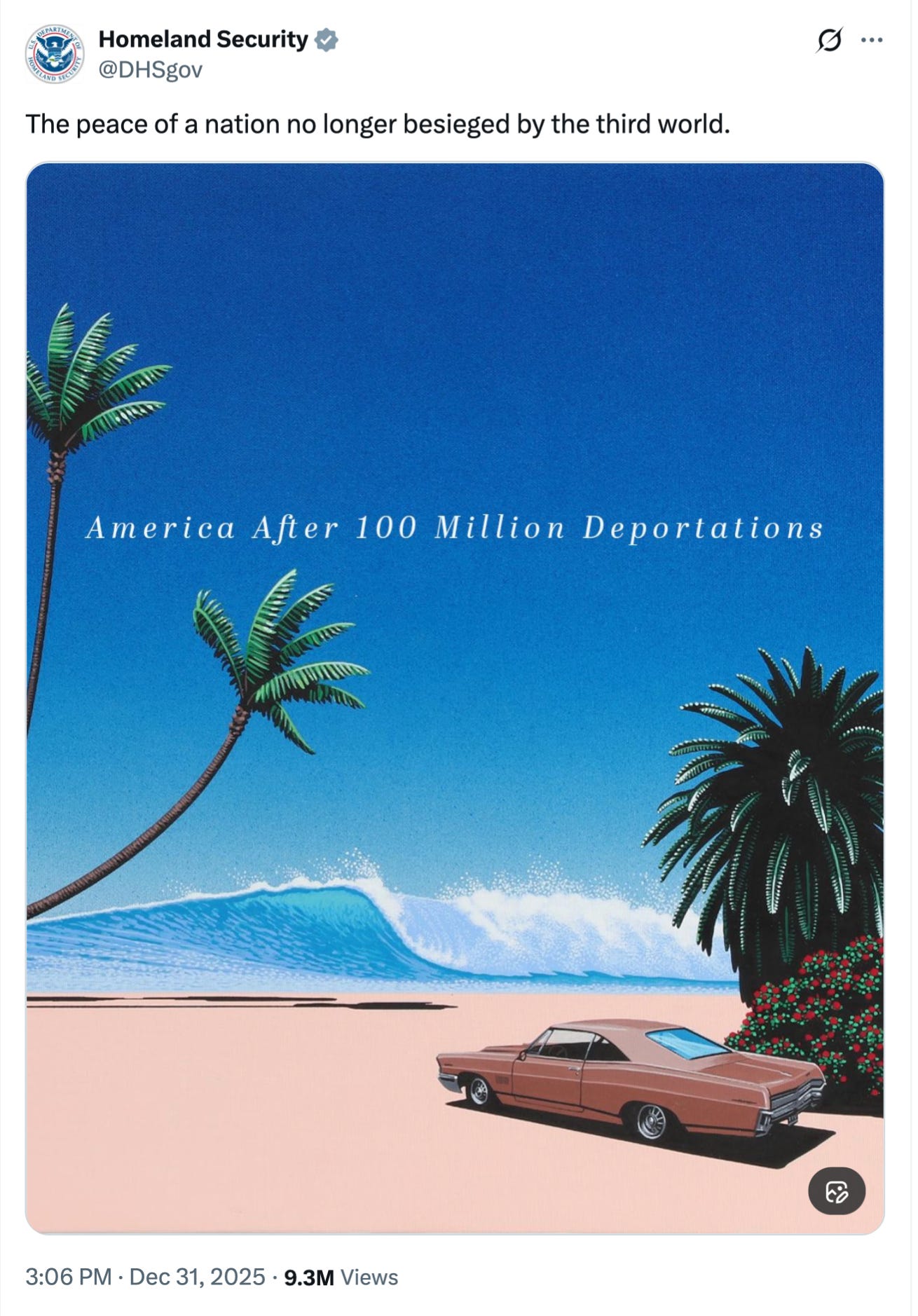 On New Year’s Eve, the Department of Homeland Security’s X account posted an illustration of a 1960’s car parked on an idyllic beach. The caption — I’m not making this up — is “America After 100 Million Deportations.”
