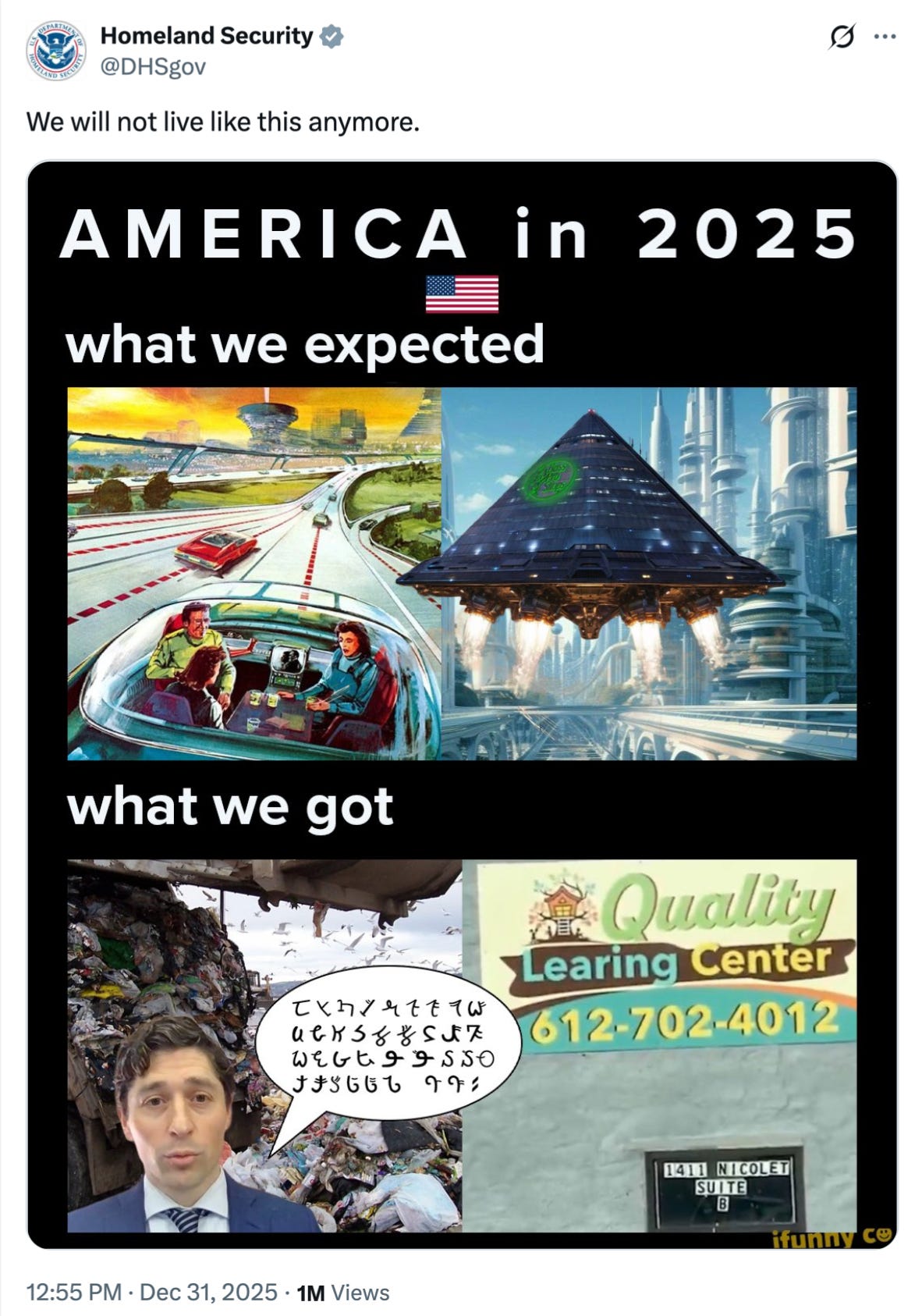 Another DHS post yesterday declared “We will not live like this anymore” over a meme titled, “AMERICA IN 2025.” It’s a play on the old expectations vs. reality meme. The post says “what we expected” above an image of Jetsons-style hover cars and a rocket-powered bass pro shop pyramid zooming through using a futuristic cityscape (lol); “what we got,” it then says, is an image of urban decay in Minneapolis and a misspelled sign for a “Quality Learing [sic] Center” — a reference to a government-funded childcare center in Minneapolis that has become a fixation for MAGA in recent days.