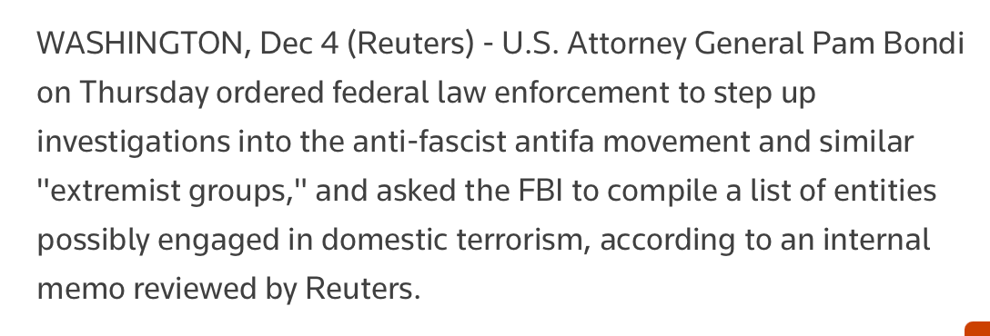 Reuters starts its story with a bullet point summary that (incorrectly) makes it sound like Pam Bondi’s order only applies to “Antifa.” In actuality, the memo cites “anti-American sentiment” in general as the animating principle of the new domestic dragnet. Other targets include those motivated by “opposition to law and immigration enforcement,” which could describe half the country, according to recent polling