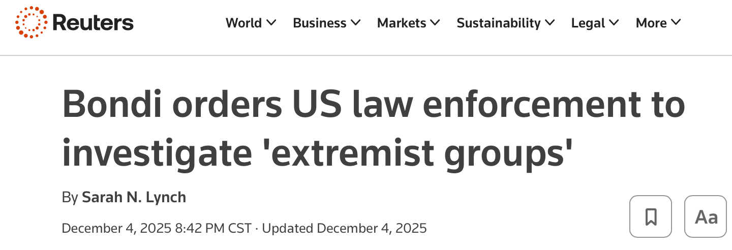 Reuters’ headline — “Bondi orders US law enforcement to investigate ‘extremist groups” — made the story indistinguishable from any number of other Trump administration actions relating to terrorism.