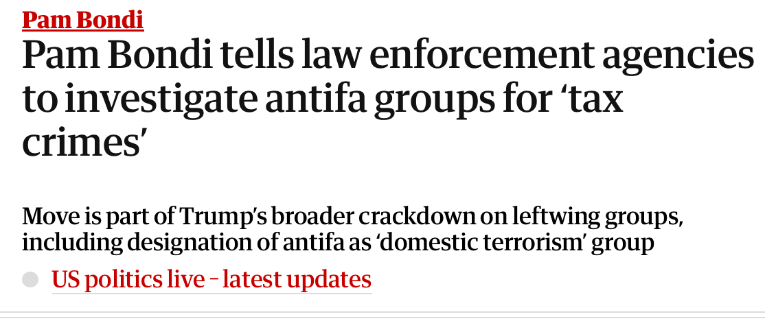 The only other mainstream media outlet to cover this, The Guardian, did even worse. The Guardian’s headline reads: “Pam Bondi tells law enforcement agencies to investigate antifa groups for ‘tax crimes.’”